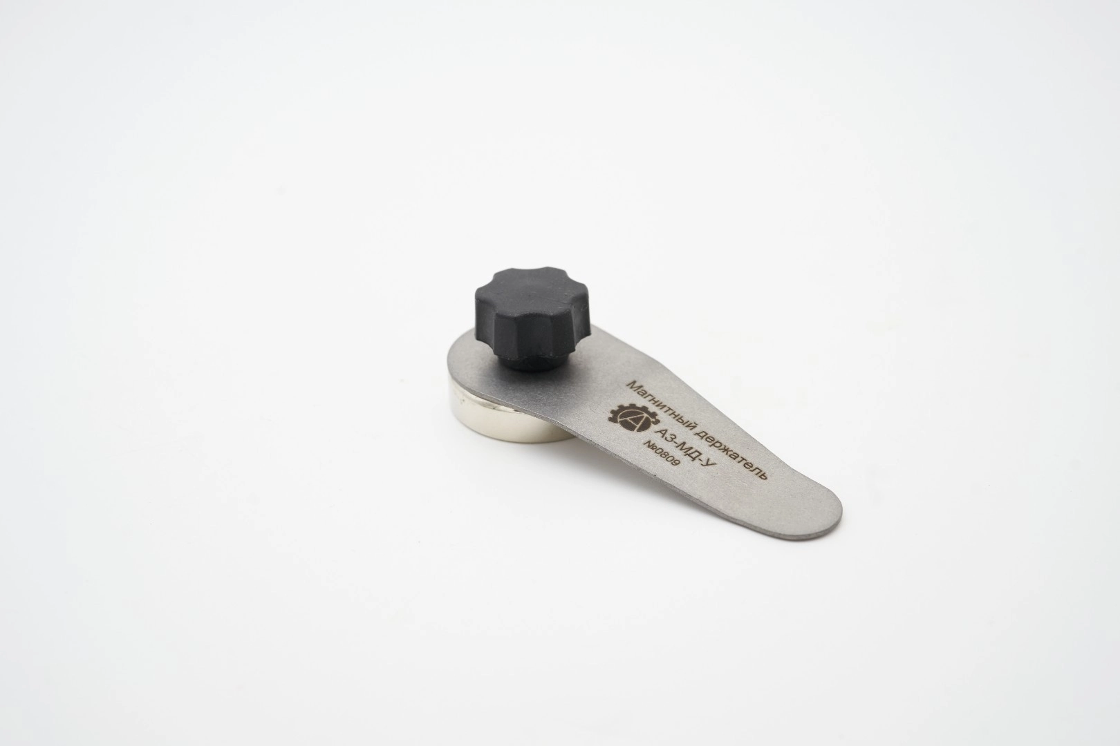 Магнитный держатель А3-МД малогабаритный с усиленными магнитными свойствами. Он состоит из металлического корпуса в виде «грибка», изготовленного из нержавеющей стали с магнитными свойствами, в нижней опорной части которого расположен высокоэнергети-ческий постоянный магнит на основе сплава Nd-Fe-B. Верхняя часть корпуса сделана для максимального удобства захвата рукой и отрыва от поверхности примагничивания. В ниж-ней опорной части находится пружинный прижим из нержавеющей пружинной проволоки, предназначенный для фиксации гибкой кассеты на месте проведения радиографической просветки.